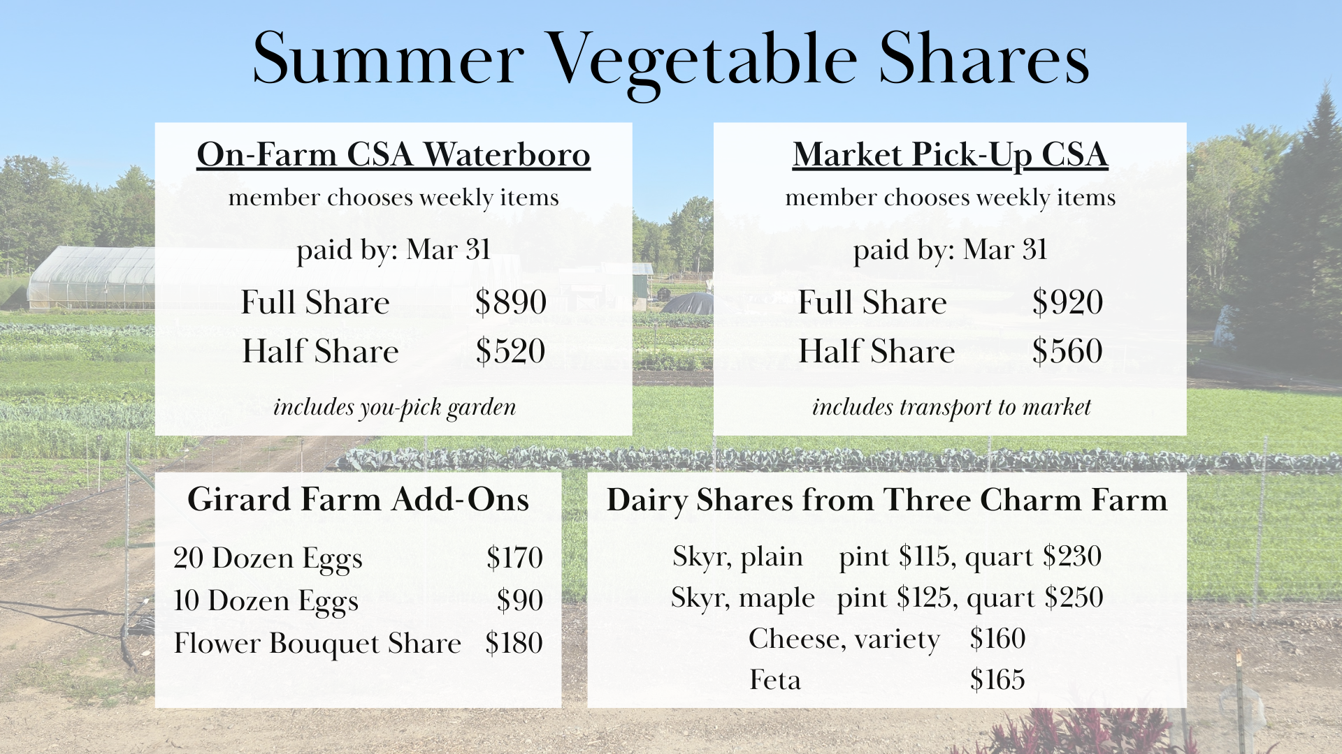Select your weekly veggies from at one of our weekend farmers' markets: Saco FM - Saturdays, 8am-12pm or Scarborough FM - Sundays, 9am-1pm.
